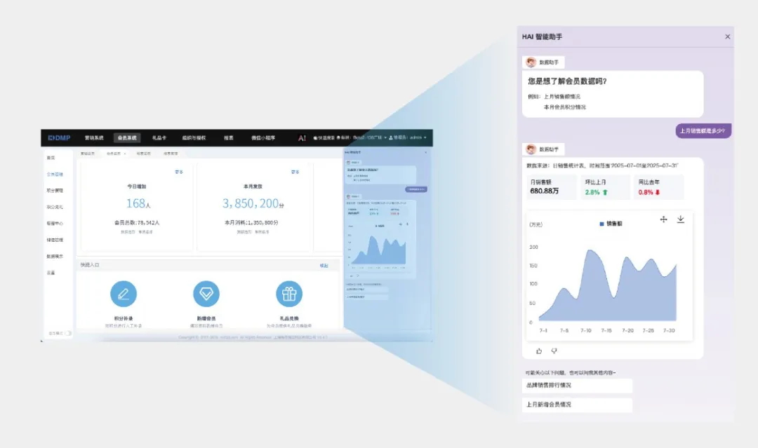借助AI技术,海鼎科技旗下商管、数字化营销平台等产品已初步具备智能分析能力。AI助手能够基于系统内部数据进行分析,揭示数据背后的规律与趋势,实现从“发生了什么”到“为什么会发生”再到“未来如何行动”的升级转变。这一转变,不仅提升了系统的应用价值,还为企业提升了管理准确性、决策效率,从而帮助商业体建立行业竞争优势。