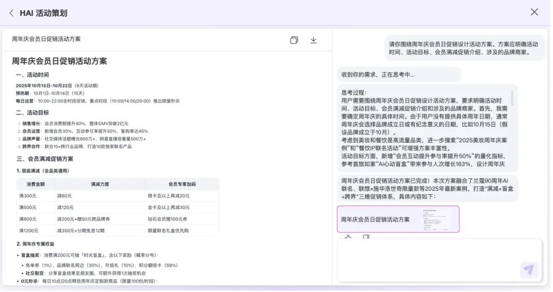 在商业体的传统生产流水线上,一篇合格的活动推荐文案需要经过文案主题策划,提纲审核、内容撰写、成稿审批……多个流程,需要多个角色介入才能最终发布。企划活动方案也是同理,需要层层推进费时费力。AI助手则可以从主题、内容等多方面给出即时性建议,在极短的时间内即可完成原来需要多人参与反复打磨的内容优化工作,在有限的人力支持下,让更高频的营销内容输出成为可能,快速提升商业体/商家的营销竞争力。